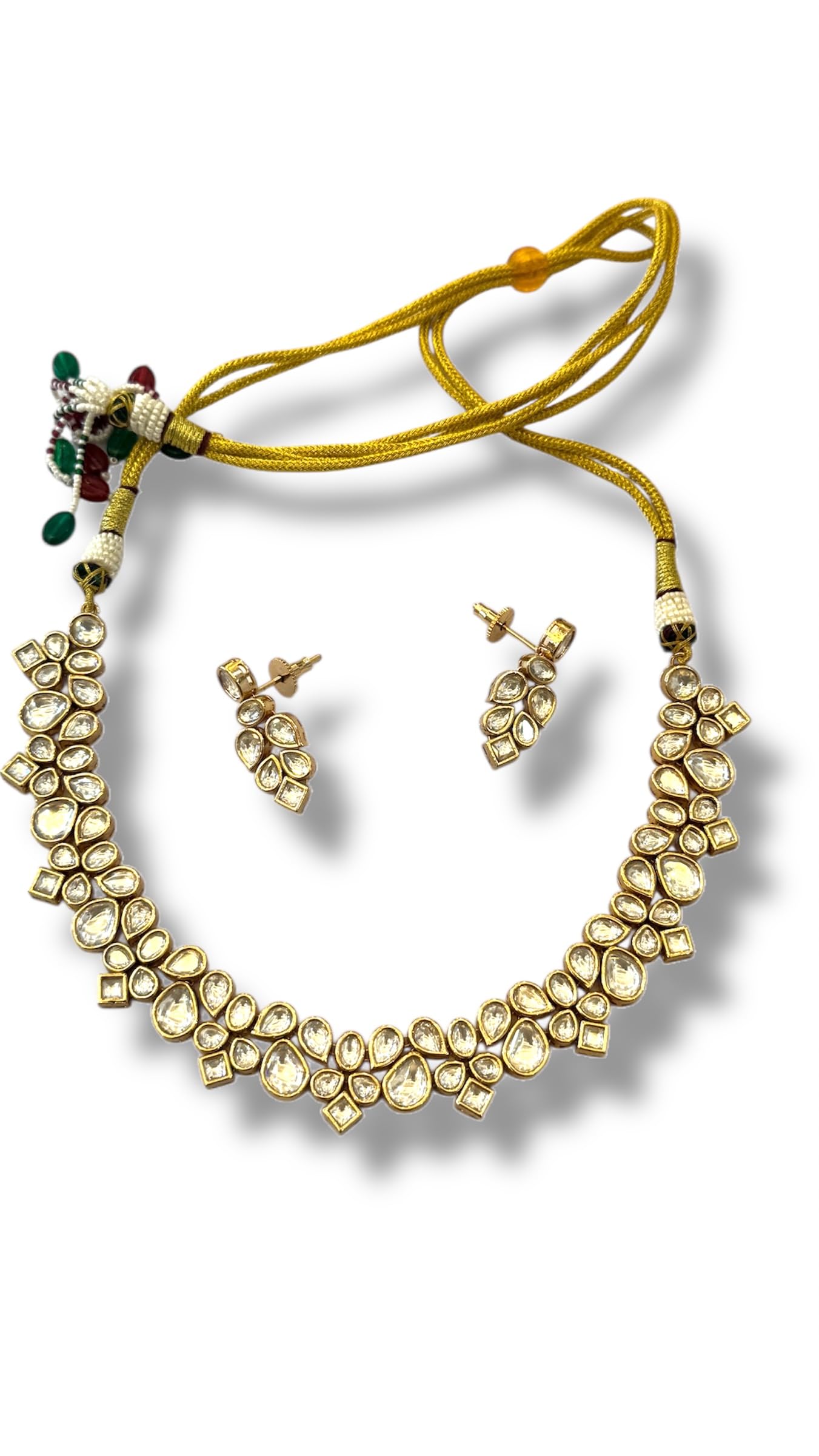 Traditional Kundan Necklace Set with Earrings, Gold-Plated, Crystal Stones, Yellow Dori