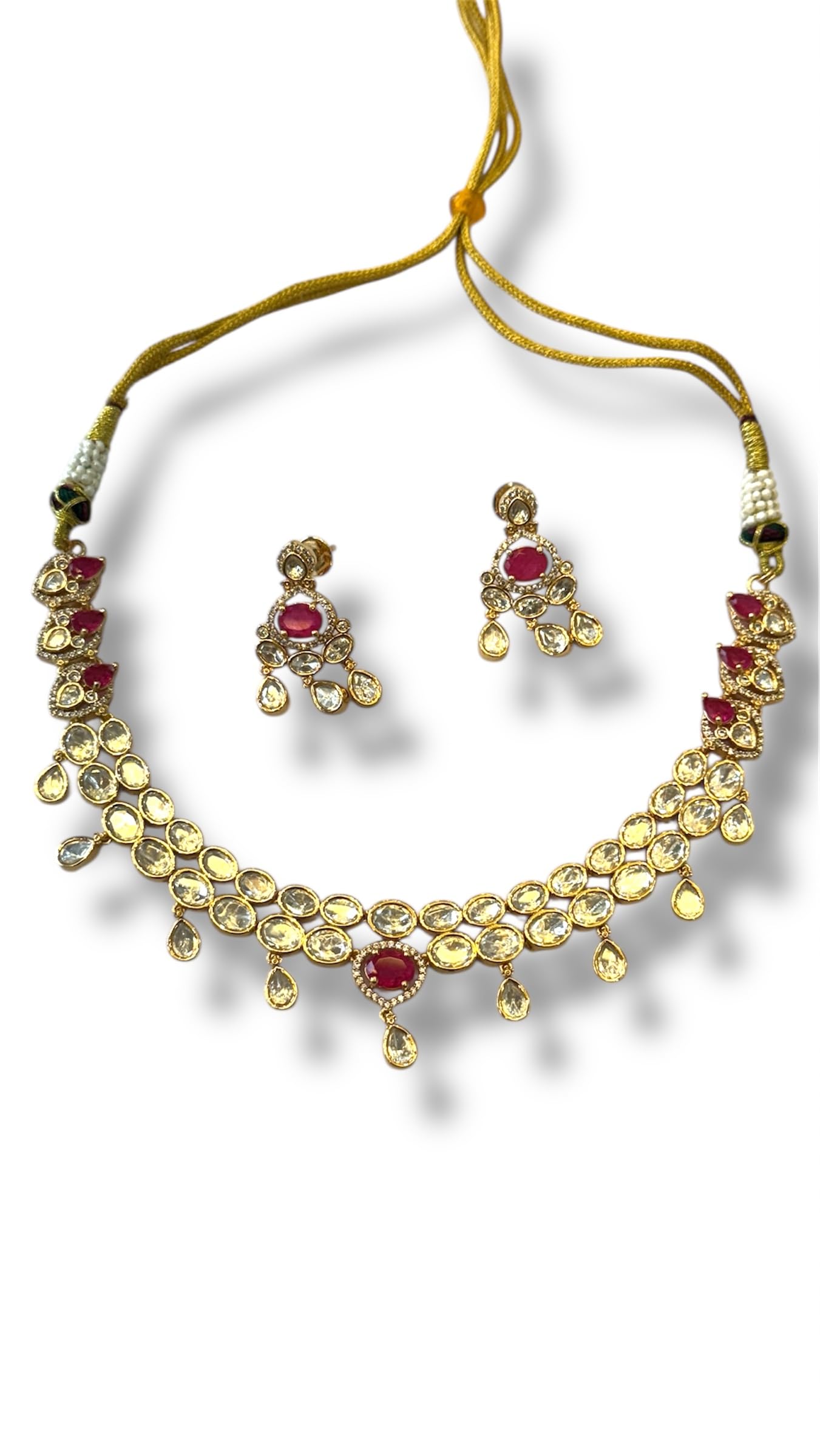 Traditional Kundan Necklace and Earrings Set, Red and Crystal Stones, Gold-Plated, Yellow Thread