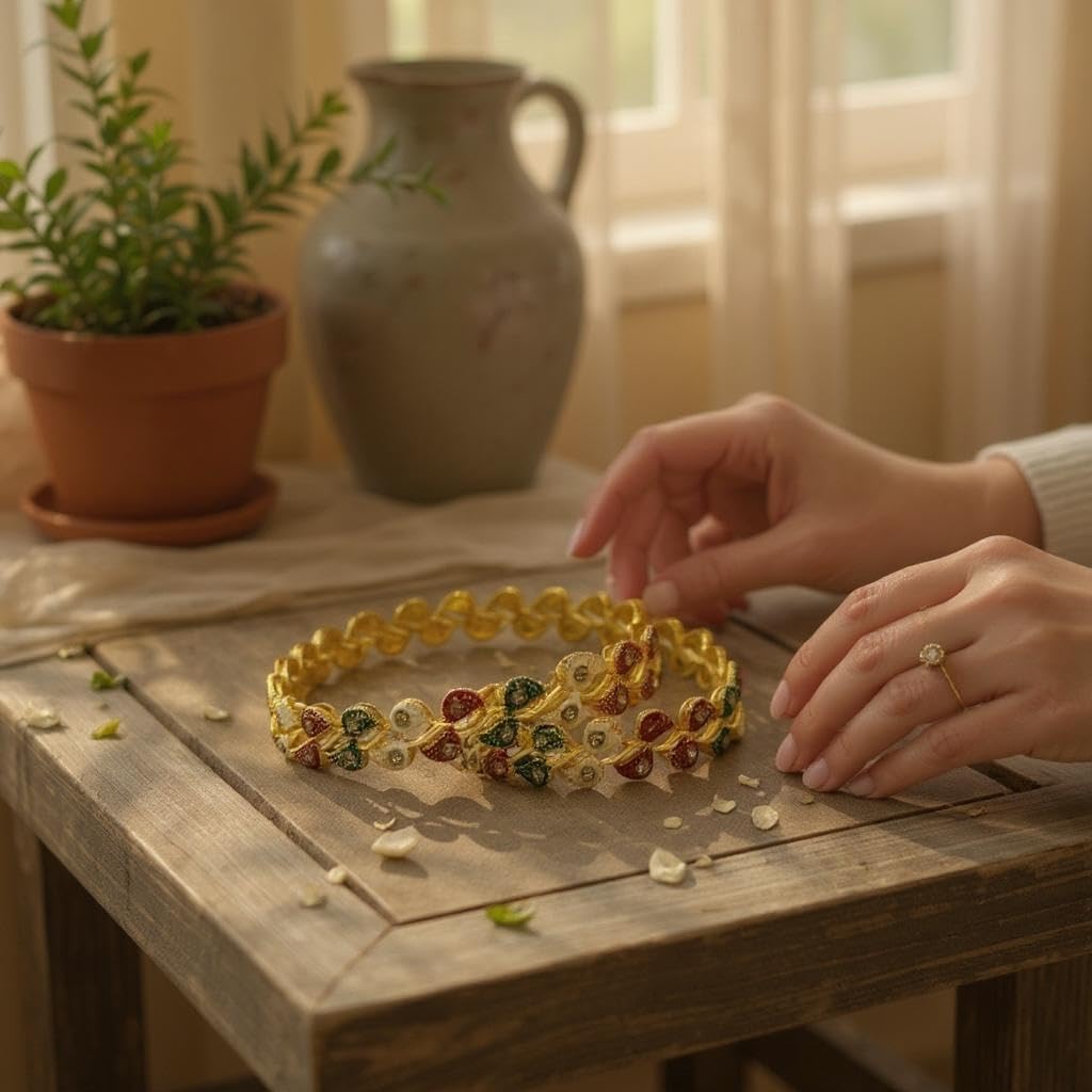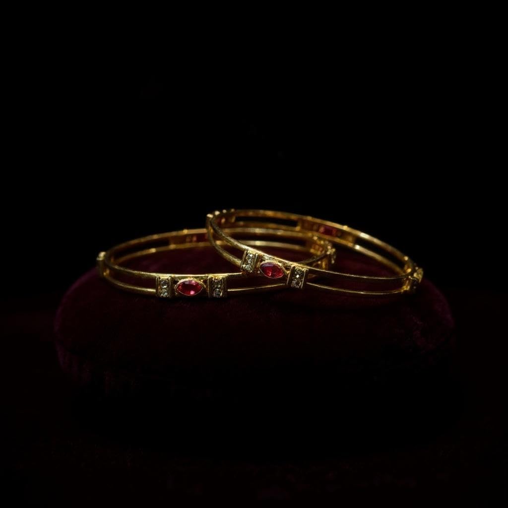 Gold-Plated Bangles with Ruby and Crystal Accents, Traditional Design, Set of 2