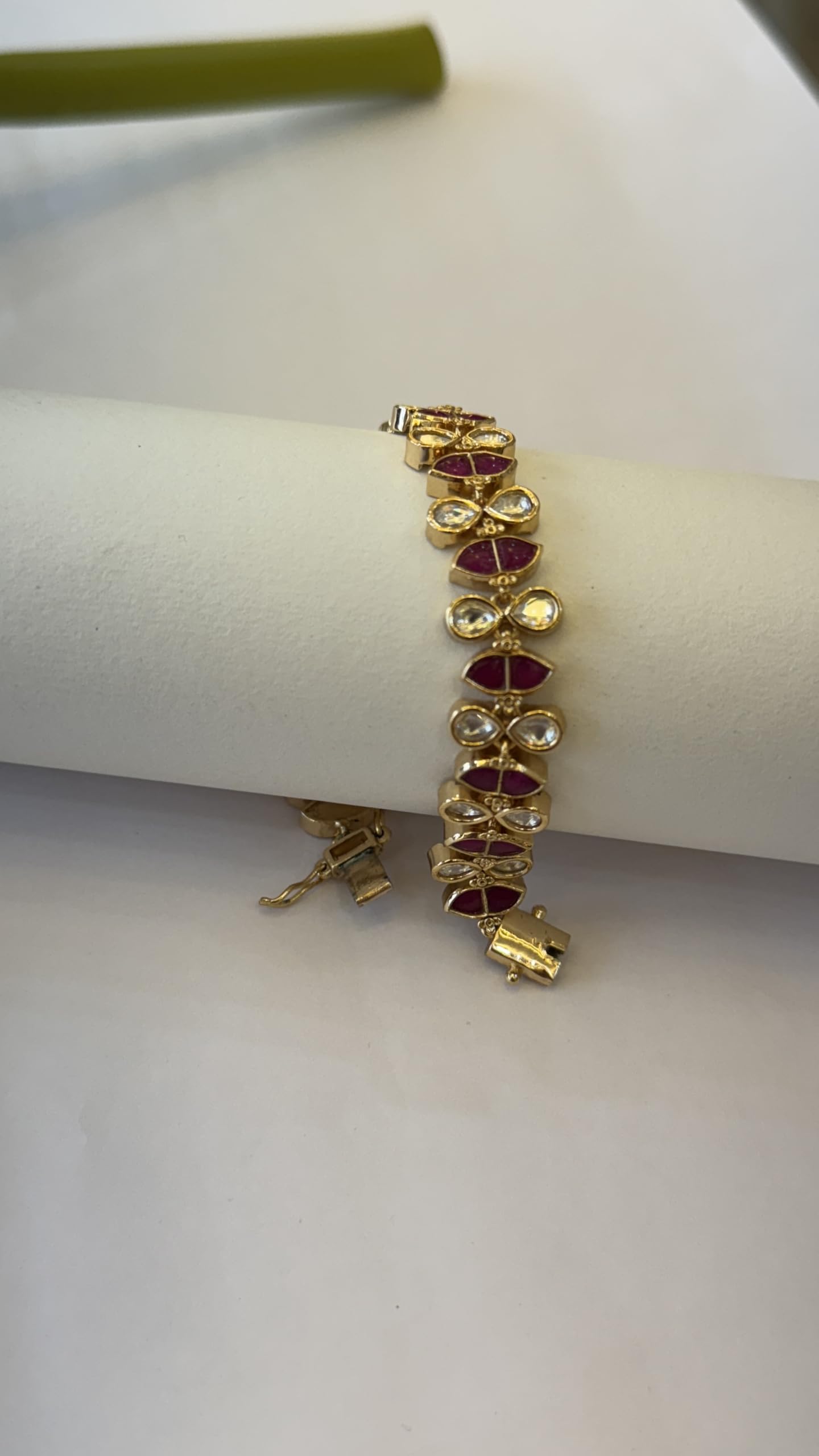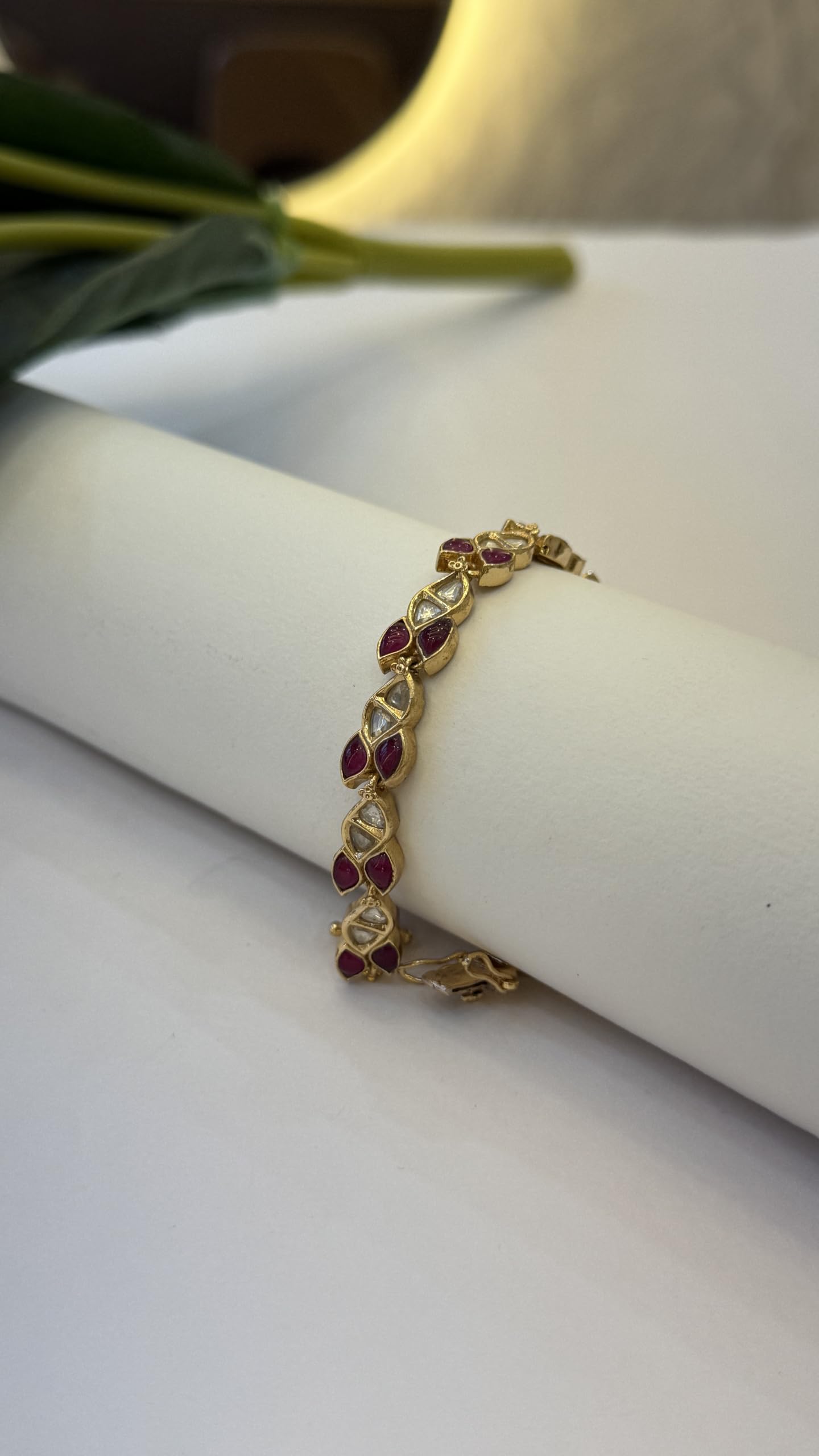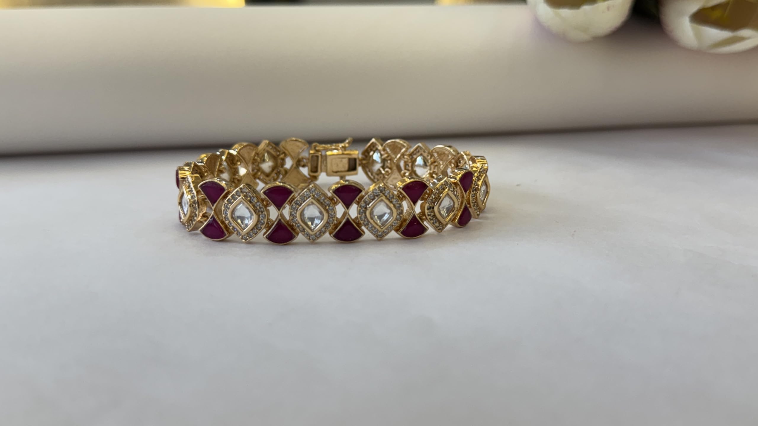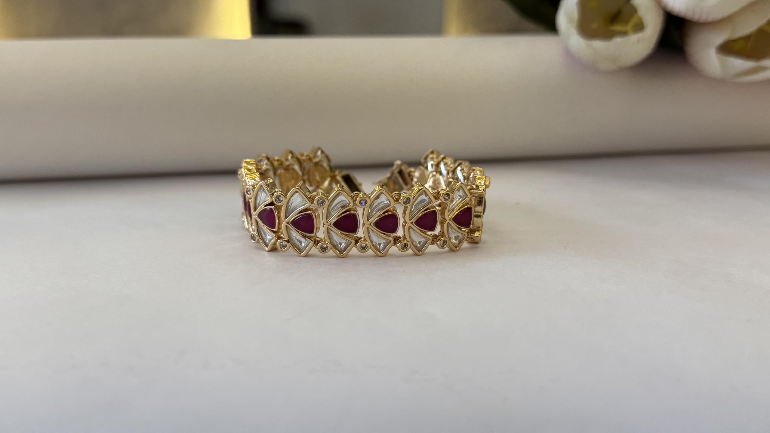 Elegant Gold-Plated Bracelet with Ruby Red and Clear Crystal Stones, Traditional Indian Design