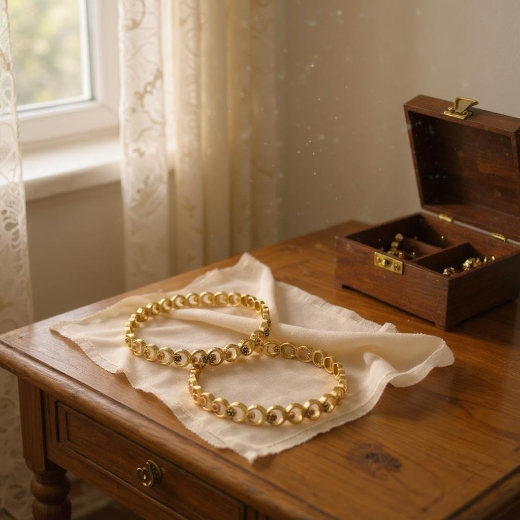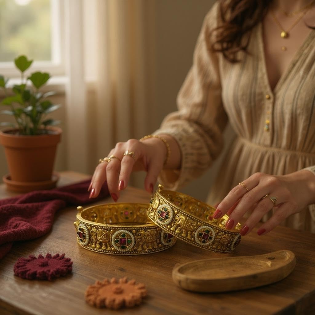 Traditional Gold-Plated Bangles with Gemstones, Antique Finish, Set of 2