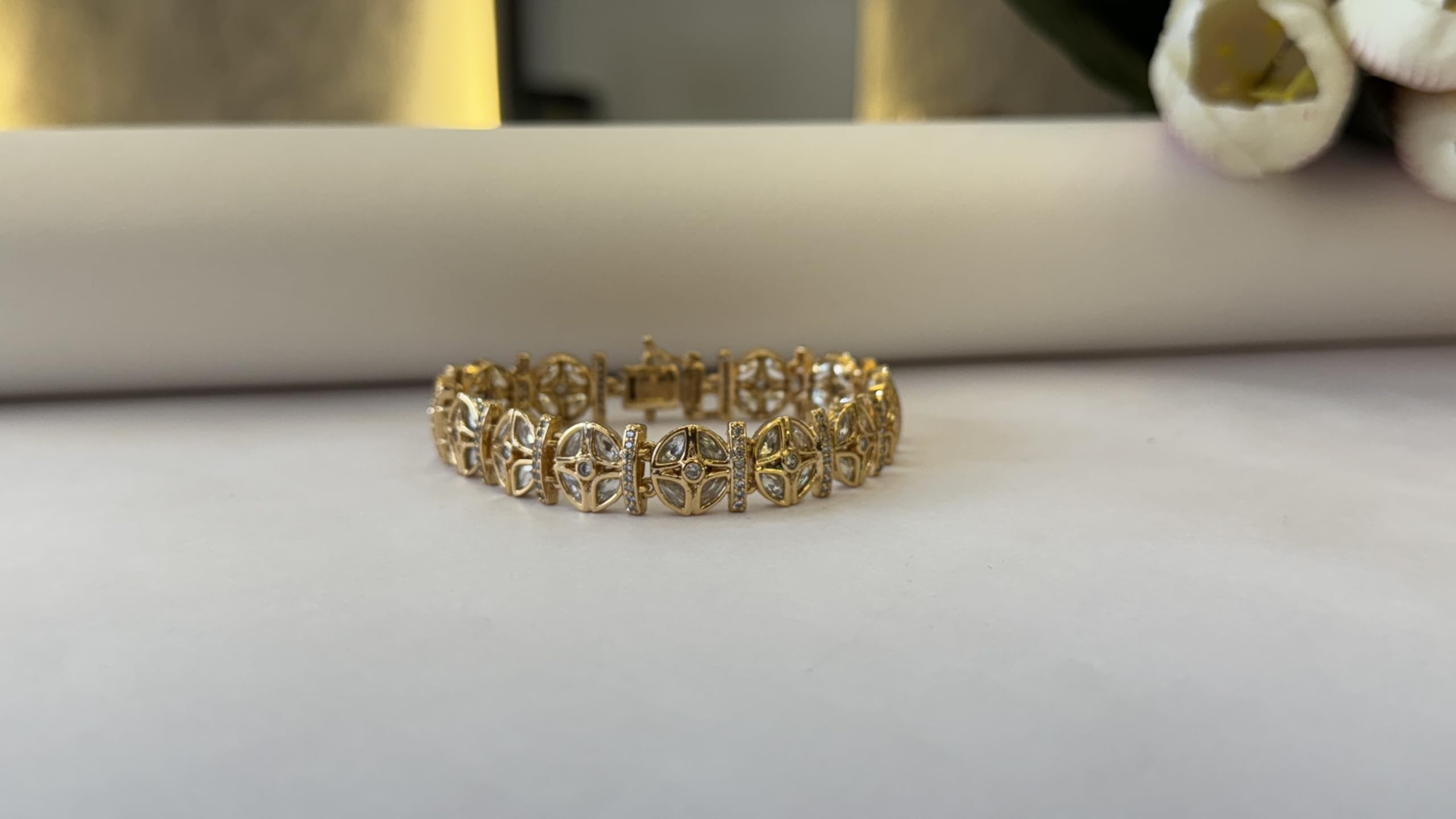 Elegant Gold-Plated Crystal Tennis Bracelet, Floral Design with Diamond Accents, Vintage Style