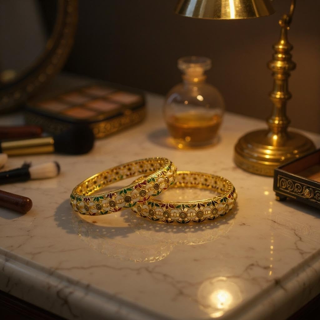 Traditional Gold-Plated Pearl Bangles, Multicolour Enamel Work, Set of 2