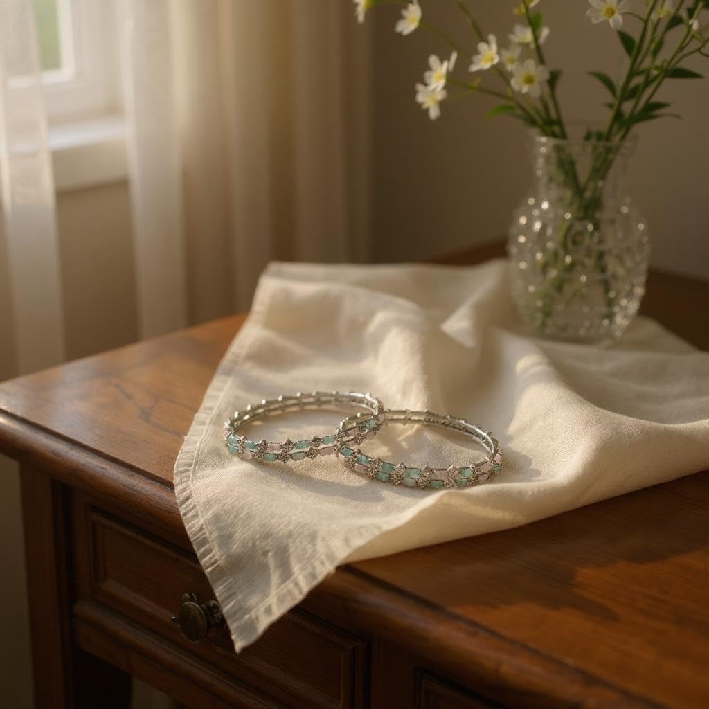 Crystal Rhinestone Bangle Bracelet Set with Mint Green and Pink Stones, Silver-Toned, 2-Piece