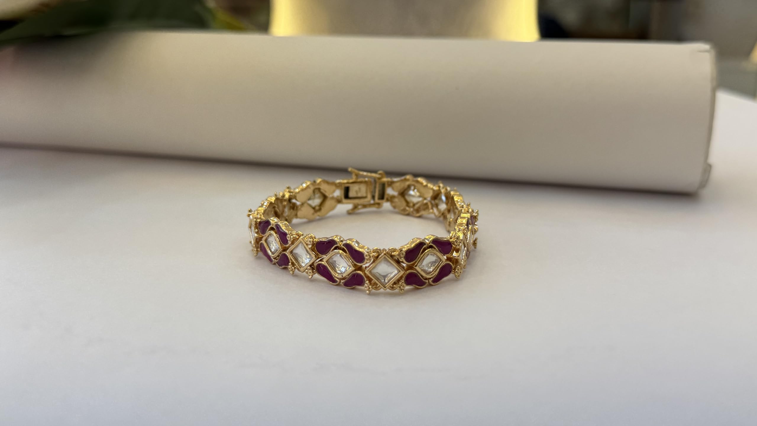 Elegant Gold-Plated Bracelet with Purple Enamel and Crystal Stones, Vintage Design