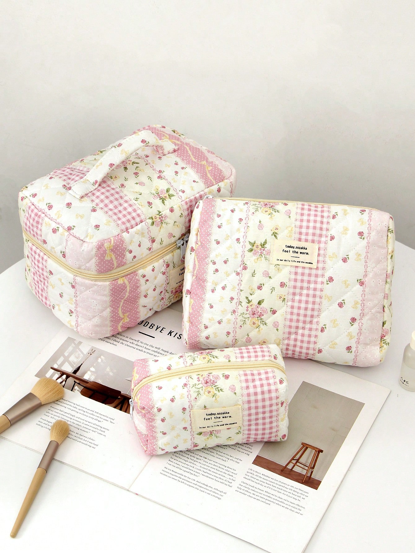 Floral Plaid Pattern Large Makeup Bag Skincare Bag Set