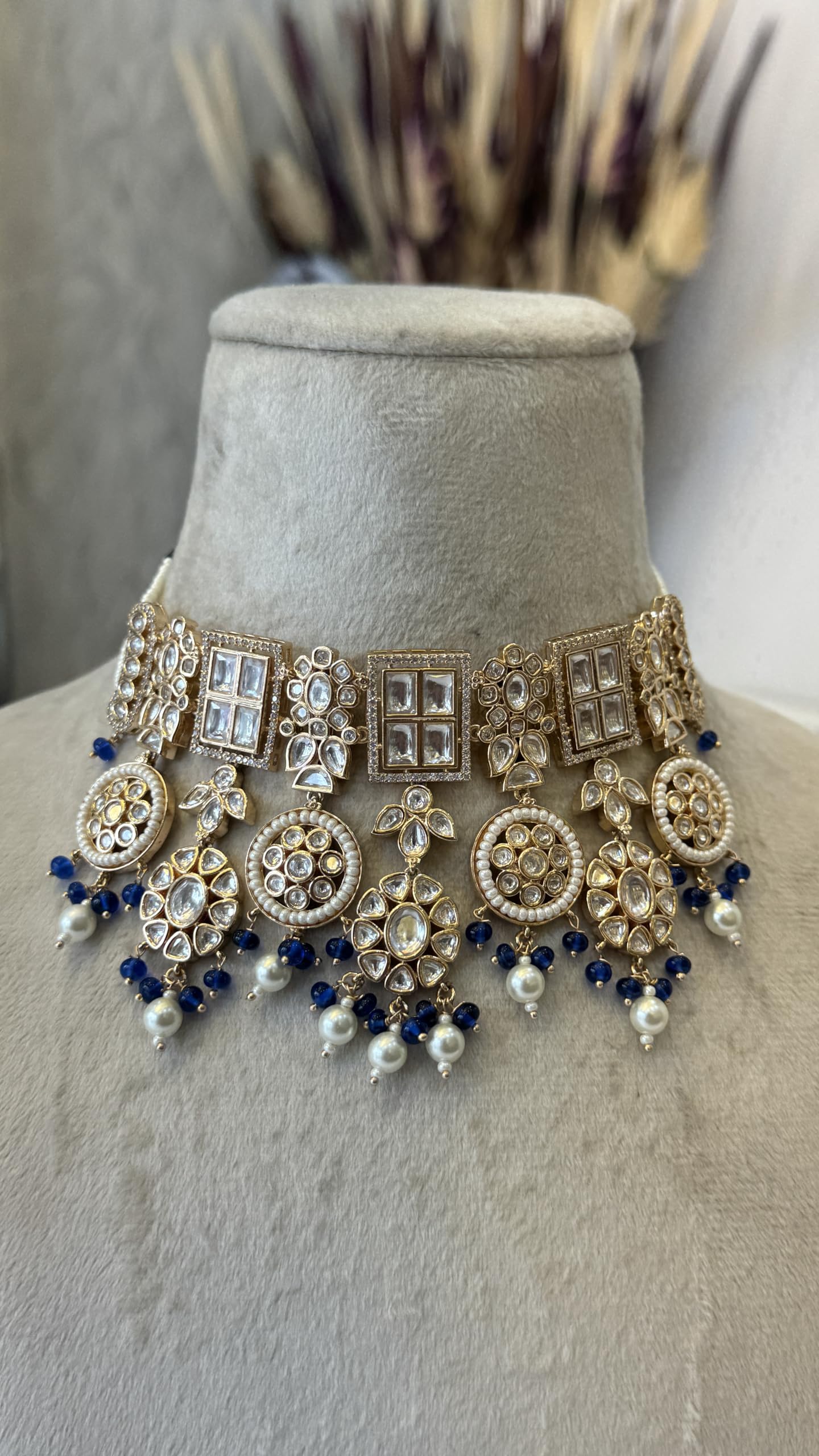 Traditional Kundan Choker Necklace Set with Pearl and Blue Beads, Gold-Plated Wedding Jewellery Set with Earrings